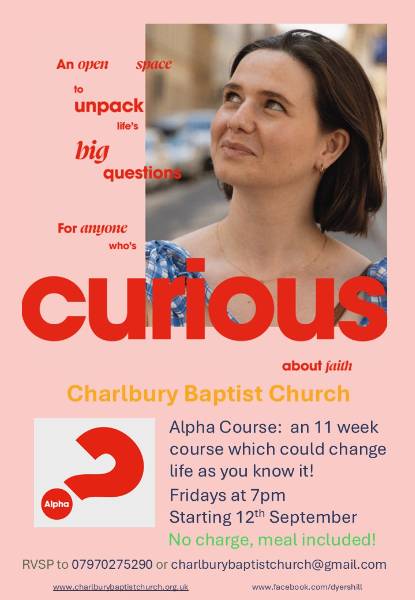 For anyone who is curious about faith, we are hosting the Alpha Course at Charlbury Baptist Church which continues on Fridays at 7pm until 5th December. This is an open space to unpack life's big questions. A Free 11 week course, which could change life as you know it! Each evening begins at 7pm and includes an informal free meal together. For more details contact charlburybaptistchurch@gmail.com or call 07970275290. Details of the Alpha course can be found at www.alpha.org