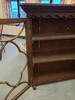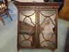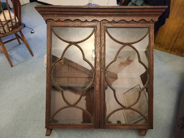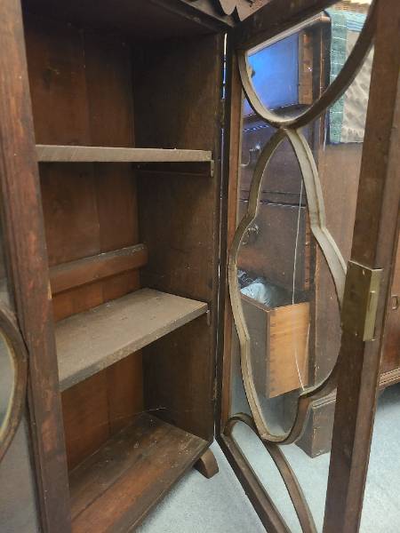 Mahogany glass fronted cabinet. 96cm h, 95cm max width, 27cm depth. Probably designed to sit on top of another piece of furniture like a chest of drawers. Some of the glass cracked. £15