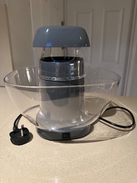 Makes fresh popcorn in 2½ minutes. Uses hot air – no oil or butter and comes with a removable plastic bowl.