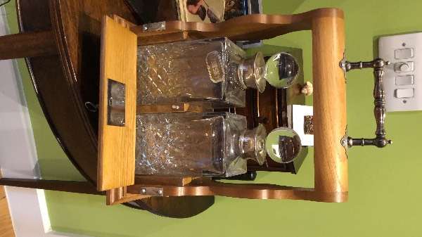 Beautiful and unused wooden enclosed tray holding two cut glass whisky decanters: perfect for the man who has everything! £30