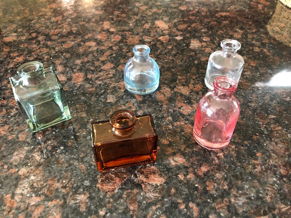 40 miniature glass bottles; 5 designs/colours; ideal for table flower decoration. £25