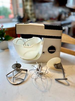 Classic 9-speed Kenwood Chef food mixer, with original mixing bowl and three attachments: K-Mixer, balloon whisk, and dough hook. All in good working order. £40 . Contact Neil - 07703516342