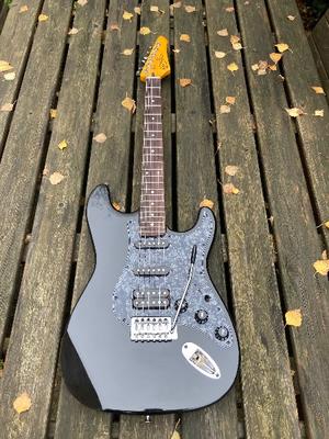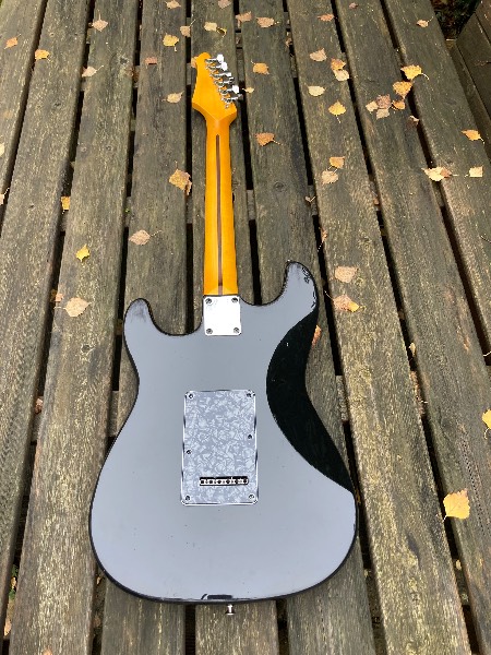 Put together professionally with a new neck, bone nut, used solid wood body, new tuners, pickups, scratchplate, backplate and electrics. Wiring modified with a treble bleed and tone knob gives control over the bridge pickup as well as middle and neck positions. A few nicks and dings in the finish. Fully set up with low/medium action, new Rotosound Ultramag 10 strings, no fret wear. Sounds great! Would suit a beginner.