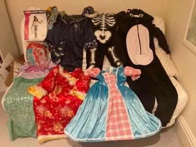 Includes costumes such as cat, skeleton, traditional Chinese outfit, mermaid, Egyptian and props like crown, glasses, etc. All from a dress up box clear out.