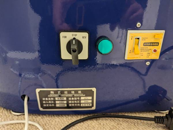 350w motor with floor pedal, safety circuit breaker and a 25cm wheel.