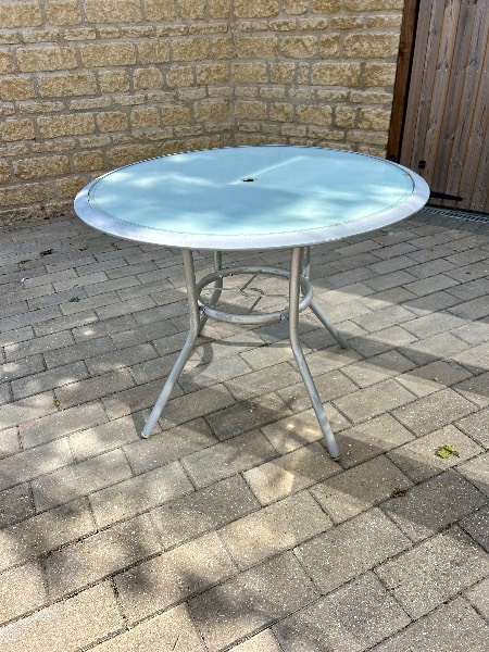 Garden table, glass top, 90 cm diameter with 2 folding chairs. Free to collect. Send a message before collecting 07531221629