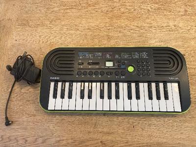 This is a Casio beginners keyboard. It is a great way of introducing young musicians to piano with 32 keys. It is has user-friendly features and layout with clearly-labelled buttons, a small digital screen and built-in speakers. It also has very fun sounds for example there are lots of different ways of playing drums.