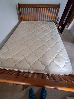 Solid timber king size bed with coil sprung mattress in very good condition. Has always had a mattress protector on. Dismantles easily, requiring an Allen Key to undo the bolts. Available week beginning 10th November. Pickup only. £50
