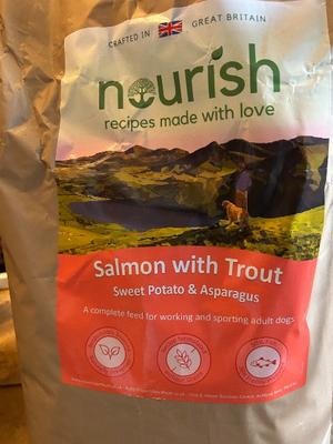One bag of around 10 kilos of Nourish dry dog food grain free salmon with trout. No longer needed. Less than a month old.