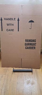 I have some surplus unused cardboard boxes. 7 boxes H 35 cm, D 33 cm, L 53 cm. Also 1 hanging garment box, with hanging rail. FREE