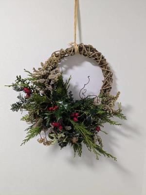Woven from wild clematis vines and decorated with locally foraged winter vegetation.