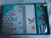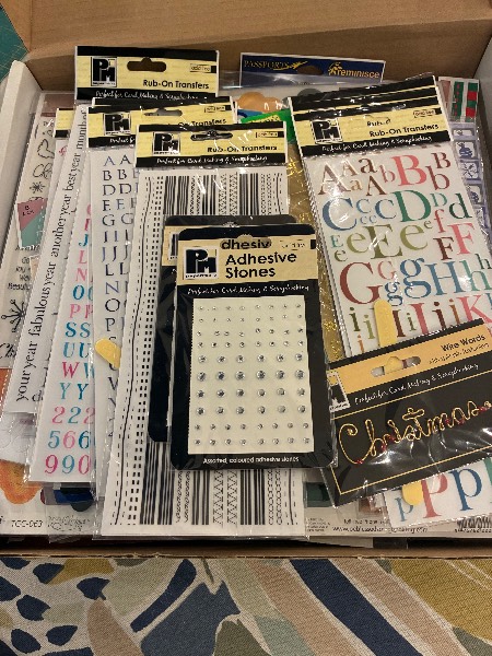 Box of scrapbooking supplies including stickers, papers, ribbons and over £20 of rub off transfers. £10