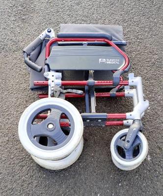 Lightweight and well made and folds down easy to fit in car boot. Comes with cushion and new waterproof leg cover. Solid tyres in good condition. Collection from Tackley or possibly Charlbury