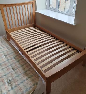 A pair of solid oak 3’ single beds with mattress available