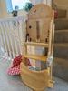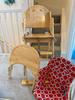 Collapsible solid wood high chair. Has a fold away tray and 5 point harness. Used but in good working order.