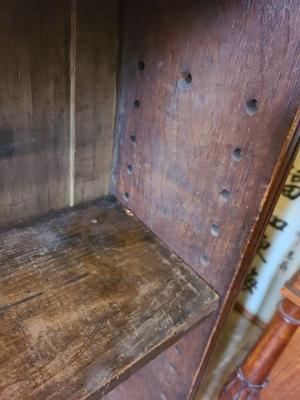 Antique bookshelf. Has two adjustable shelves, just needs to fashion more pegs/bits of dowel to hold shelf up. Decorative top part is removable. About 120cm max width 110 height. £10