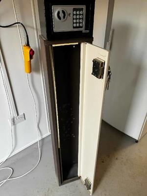 Free shotgun/ rifle cabinet, fits one rifle or two shotguns, w separate safe for ammunition bolted to top. Two sets of keys. 0796 339 2088.