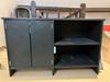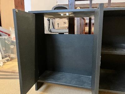 Small TV table which I made to sit in an alcove. Painted charcoal black. Cupboard with magnetic catches (need a bit of adjusting) and two shelves. Paint chipped in a few places.