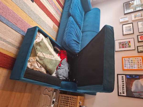Sofa from MADE.com for sale, used but in good condition. Sofa bed included with built in mattress and good sized storage section in the chaise section. Selling as we need the space. Looking for £200 ono,