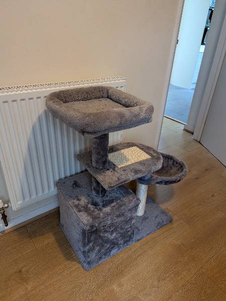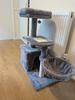 Small cat tower covered in grey fluffy material. With scratching mat and post, hanmock and enclosed sleeping area at the bottom. 80cm high, 80 cm wide and 35cm deep. In great condition, barely used as we bought a higher one.