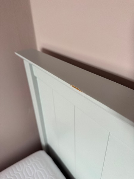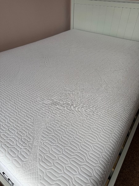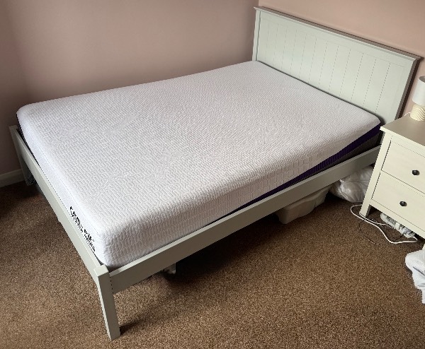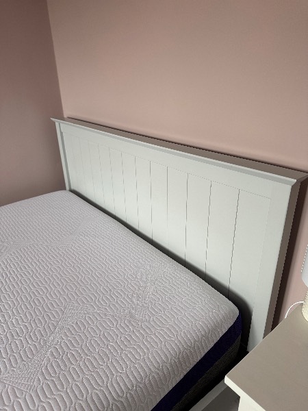 Wooden double bed painted pale blue grey. Couple of small marks on the headboard. Available with or without the mattress (mattress also available separately). Mattress is a REMfit 400 - still in good condition and a good quality mattress protector has been used since we got it. We purchased it five years ago but it’s been used infrequently in the spare room for the last three years.