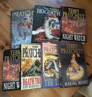 Five large, two extra large, hardback Terry Pratchett books for sale.