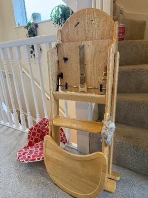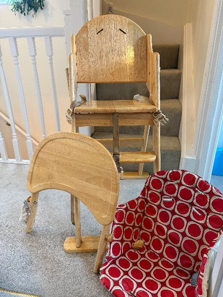 Solid wood collapsible high chair with wooden tray that can easily be folded back when not in use.