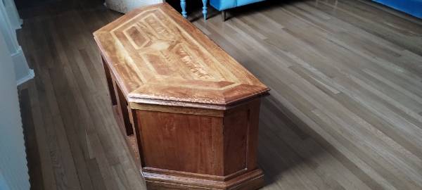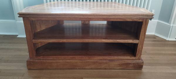Originally from M&S. Mango wood with inlaid detail. Good condition. Height: 56cm. Width at front: 110cm. Depth: 50cm. Please contact Hannah on 07985 573652.