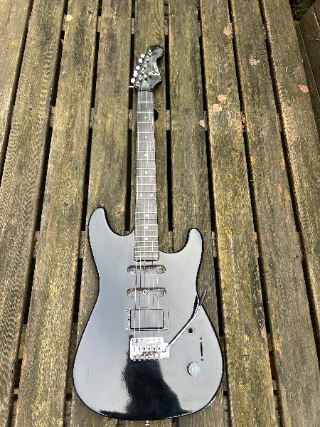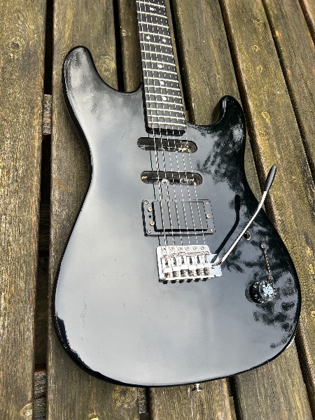1980s or early 90s, Korean Encore Strat. Stripped down to a 1 pickup 1 volume, simple rock/punk guitar. Humbucker pickup is original to the guitar and is bright and aggressive. Single, quality CTS volume pot and new output Jack.