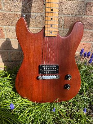 1970s Double cut Telecaster style guitar. Clearly built by someone who knew what they were doing. 3 piece mahogany body, maple neck, Japanese Maxon super 70 pickup, wraparound bridge carved to intonate properly, Ibanez tuners.