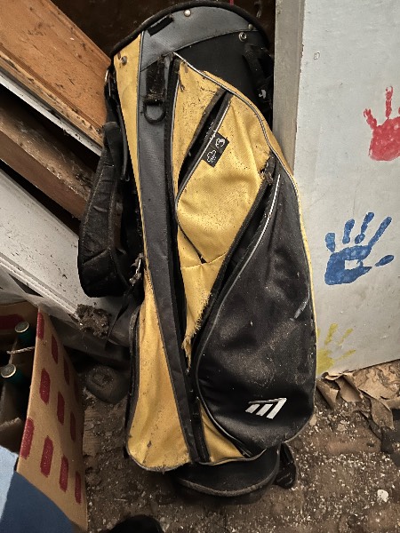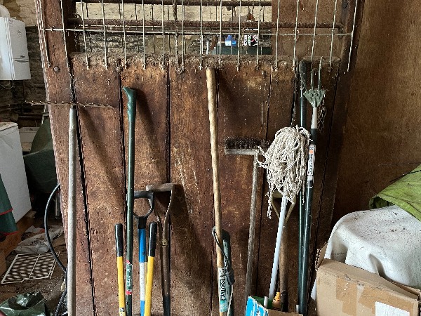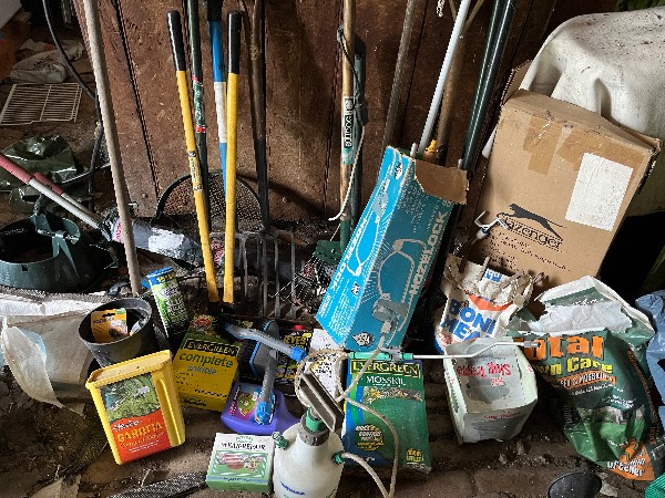 Clearing out a garden shed - sundry tools, lawn maintenance, coal, tennis ball hopper, Cornhole game, golf bag …