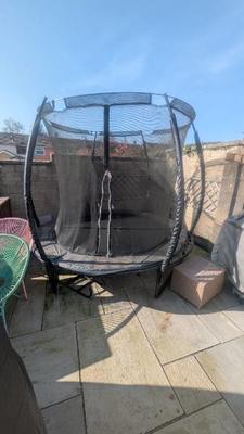 6ft jumping area and 8ft in total. Could use a new spring cover but the pole covers are in good order. Well loved but no longer being used. Please email me on rachelclaridge8@gmail.com or contact me via this website. £40 ono