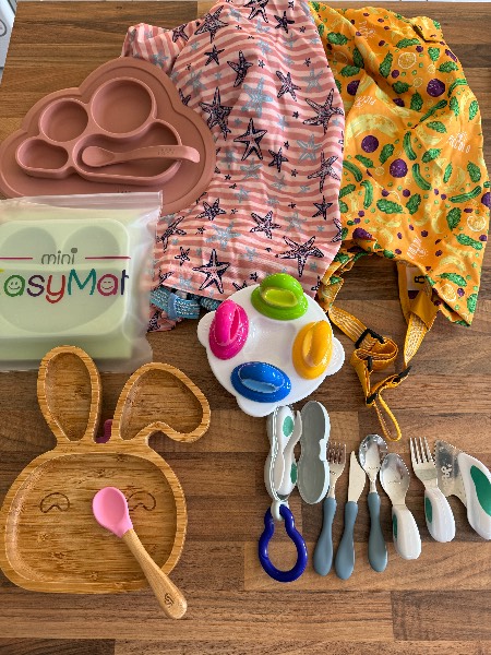 Bibs, assortment of cutlery, plates and a nuby lolly pop mould you can use to freeze yoghurt etc.