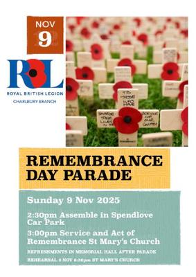 Please join us for the Remembrance Sunday Parade and Service on Sun 9th Nov 2025. The Parade will commence from the Spendlove Car Park at 2.30pm and the Service of Remembrance at 3pm at St Mary's Church, Charlbury. Following the Service, the salute will be taken by the Lord Lieutenant, Marjorie Glasgow, outside the Charlbury Museum. The Parade will fall out in front of The Bell thereafter. Teas and coffees will be served at the Memorial Hall where all will be welcome.