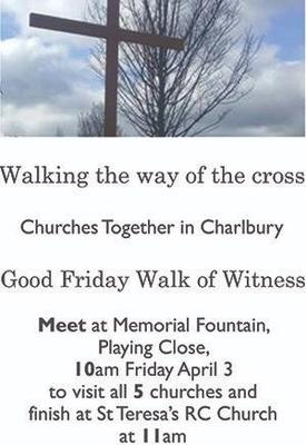 Good Friday, 3 April - meet at 10am by the fountain on the Playing Close for Walking the Way of the Cross. This is a reflective walk round the centre of Charlbury, visiting each of the churches for readings, hymns and prayers, finishing at St Teresa's RC church at about 11am for refreshments. Everyone is welcome.