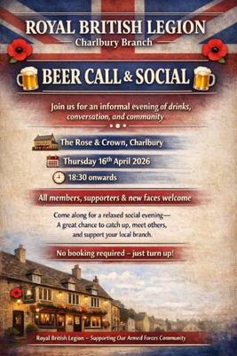 We are having another social for any RBL Charlbury members and friends or anyone else who would like to be involved. In the downstairs lounge at the Rose and Crown on Thursday 16th April 2026 at 18:30.
