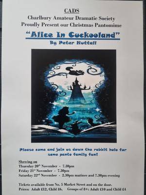 Fri 14 Nov, 21:00 (last edited on Sat 15 Nov, 09:18) The time is drawing nearer, CADS have their get in today 15th Nov, which can only mean that time is getting closer for their Panto "Alice in Cuckoo Land " to kick off on Thursday 20th November. Have you got your tickets yet ? |