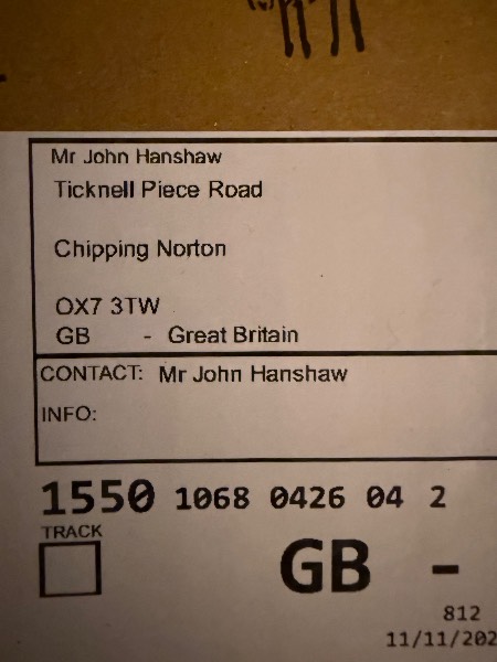 Mon 1 Dec, 14:42 A parcel was left outside outside our front door addressed to John Hanshaw. It was addressed to Ticknell Piece Road without a house number. |