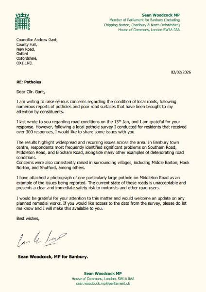 Thu 5 Feb, 09:45 It would be nice, if, instead of writing letters to the local authority, our MP spent his time lobbying his treasury colleagues to get proper funding for our roads. |