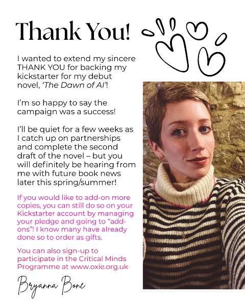 Mon 26 Jan, 11:29 Only 4 HOURS left to reach my kickstarter goal! We are SO close with only £668 left to raise! 🙏🏼 Every pledge counts! Rewards available: £5 Digital E Book £15 Paperback £25 Hardback £50 Hardback & thank you in first print (You can also add-on more copies for gifts!) £250 Sponsor a school to do the programme and debate speech competition £450 Underwrite 30 copies for a classroom in need Go to https://www.kickstarter.com/projects/thedawnofai/the-dawn-of-ai-ya-sci-fi-novel ! Back this project and be part of something bigger ❤️ Back this project and voice that YOU believe AI literacy and youth empowerment are worth fighting for!