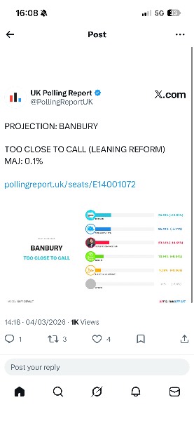 Thu 12 Mar, 16:23 (last edited on Thu 12 Mar, 16:29) Poll shows that Banbury is a three marginal between Sean Woodcock for Labour, Reform and Tory. Sizeable Green vote, if they vote tactically it could ensure that Reform are kept out. Liberals seem to have got the tactical message, but could be squeezed more. Tactical voting is the best we’ve got until PR is introduced. |