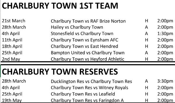 Wed 1 Apr, 09:27 (last edited on Wed 1 Apr, 09:28) Also check out the Charlbury Town Facebook Page on a weekly basis https://www.facebook.com/profile.php?id=61585290958914 and their website https://www.charlburytown.co.uk/fixtures-and-results |