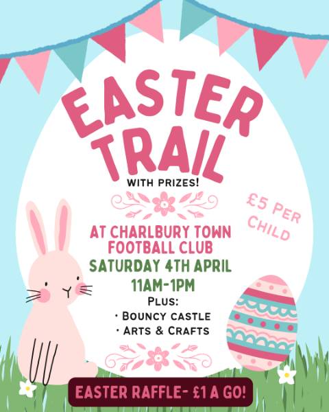 Mon 30 Mar, 07:38 π£ Easter Trail - Saturday 4th April! π£ Join us 11am-1pm for our family Easter Trail! Find the hidden eggs, follow the clues, crack the secret word and win a prize! But thatβs not allβ¦ π Bouncy Castle π¨ Easter Arts & Crafts ποΈ Easter Raffle - Β£1 a go! π Β£5 per child π Charlbury Town Football & Sports Club Come join the adventure! π°π