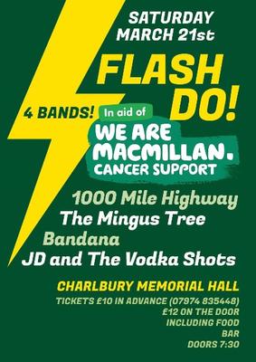 The Flash Do in aid of Macmillan at the Memorial Hall is less than 3 weeks away on Saturday 21st March. Advance tickets are selling really well so if you want to take advantage, please call or email Dave on 07974 835448 or dpoates@gmail.com. 4 bands, performance art, food and bar!!