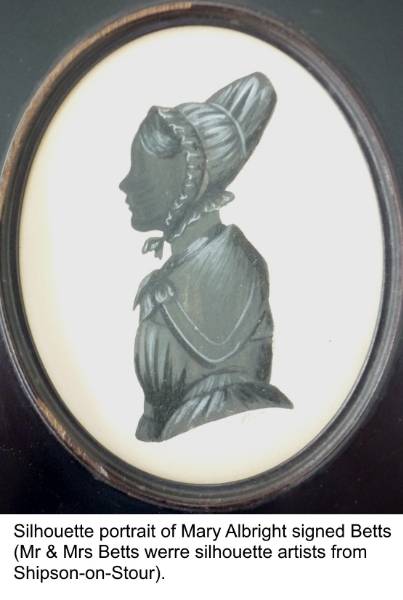 In the museum, hanging close to her silhouette portrait, is an embroidered map sampler worked by Mary Albright, signed with her name and dated 1817. Mary, born in Charlbury in 1803 was the oldest of six children. Her parents William and Rachel Albright (nee Tanner), were a prominent , prosperous Quaker family whose Church Street shop (now the Heat Store) sold groceries and pharmaceuticals. Mary’s silhouette profile (see photo) is displayed surrounded by Albright family silhouettes