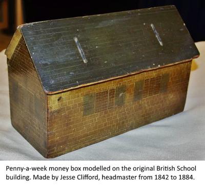 Jesse Clifford was appointed in 1842 at the age of 26 on a salary of £40 per year and taught here until he retired in 1884 . To encourage the children to bring their money to school each week, he made this box so the children could post their pennies in every Monday morning.