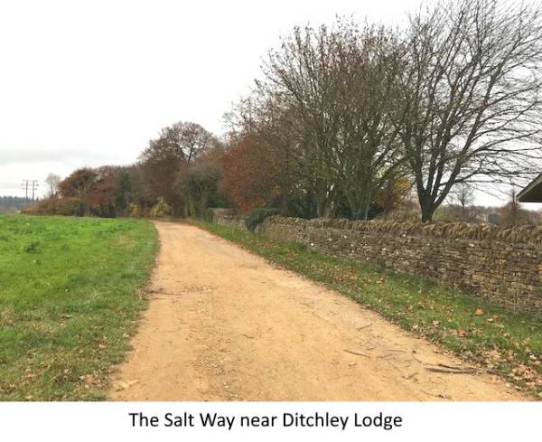 The Salt Way can be accessed via Hundley Way, the Ditchley Road or along the footpath by Dustfield Farm. In one direction the track heads north towards Chipping Norton and then on through Gloucestershire and Warwickshire to Droitwich, while in the other direction it goes to Stonesfield and on to join Akeman Street. Salt was carried by pack horses and also transported by river. The Thames offered a good route to London which required huge quantities of salt for its growing population.