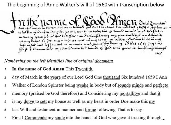 On 20th March 1660 Anne wrote her will. There is no record of her death but probate was granted in 1667 for Anne Walker spinster of London.
