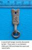 Then there are three musket balls of differing sizes, two white and one darker. Musket balls were in use from about 1550 to 1800. It's not possible to date these, but they may relate to the English Civil War 1642-1651: there were skirmishes all over the country and there was a Civil War battery at Cornbury Park. Whitening of lead occurs due to oxidation, which progresses through time. The dark ball is therefore likely to be more recent than the others. The side of the small white ball is flattened, suggesting impact. The larger ball is likely to have been fired by a musket (a muzzle-loaded long gun), the two smaller balls probably from hand-held pistols.